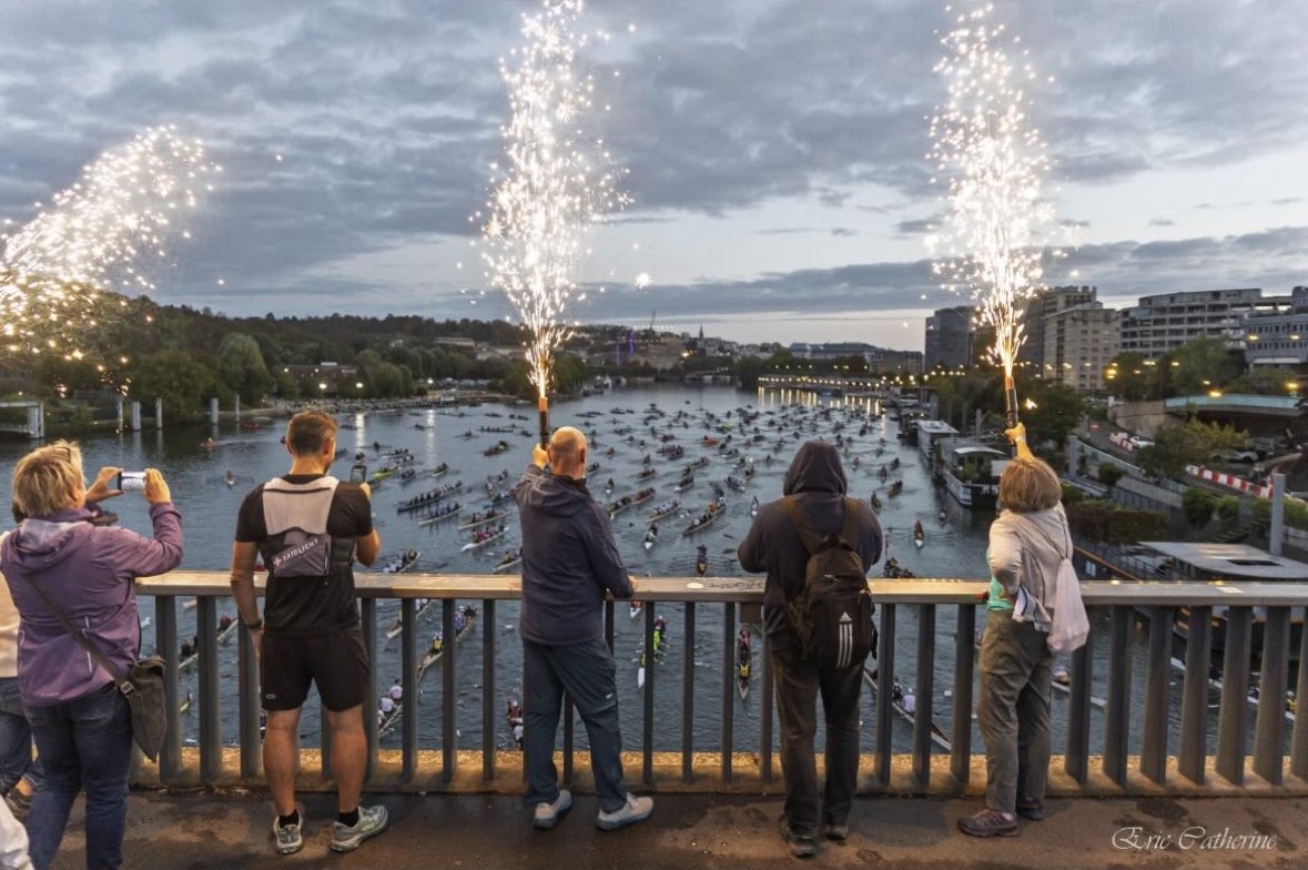 In het schemerdonker dobberden we omringd door alle andere teams op de Seine. Om stipt 7.15 uur: vuurwerk vanaf de brug als startsein. 285 Boten probeerden zich tegelijkertijd een weg te banen onder de brug door. Het navigeren door het woelige, rommelige water was een uitdaging; we zig-zagden tussen de andere boten door en commando’s “ houden”, “ pak maar weer op”, “ light” werden in rap tempo afgewisseld.